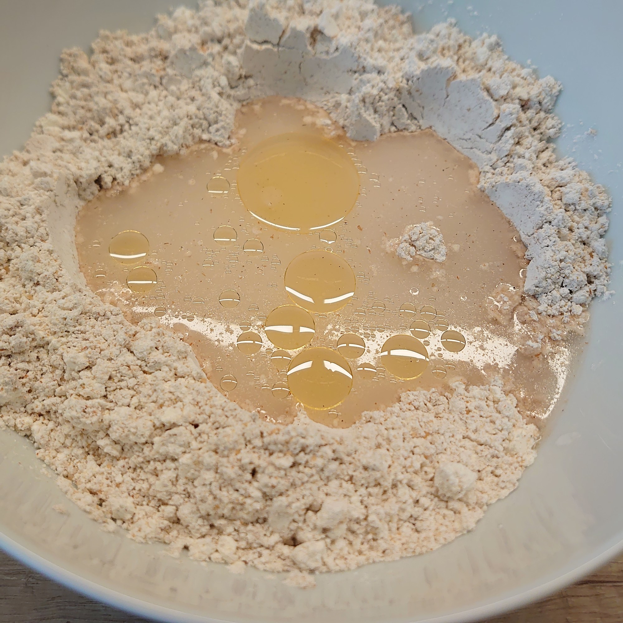 Pick a medium size bowl and mix in all the dry ingredients together: flour, psyllium husk, yeast, salt and sugar and stir to combine well. Make a small well in the middle of the dry ingredients. Add in the water and then the olive oil in the center of that well.