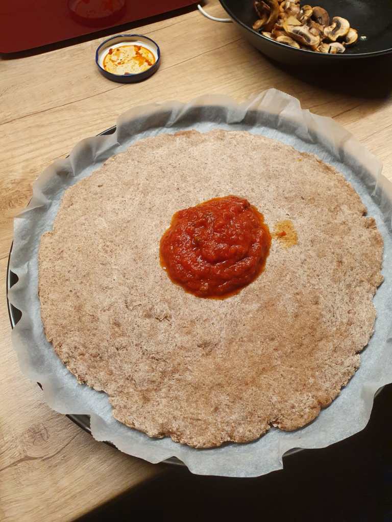 These ingredients should be enough for 2 small pizzas. After resting, take the composition, and split it into 2. Spread it evenly on the pizza pans (I prepare the pans with a baking sheet to make it not stick and easy to slide on the plate). Bake the base in the oven at 180ºC (360º F) for 10 min.
