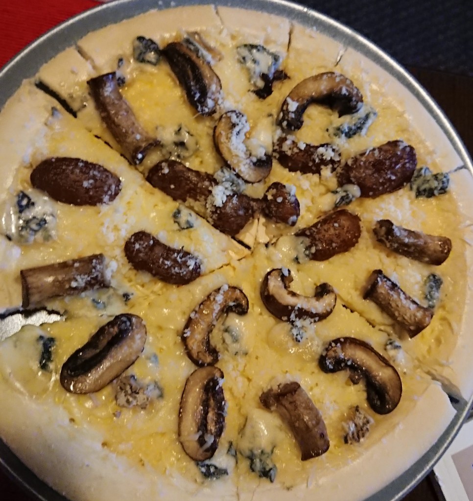 Cut your vegetables in thin slices. Slightly roast the mushrooms in a pan over medium heat for 5 min. The same can be done with the zucchini slices, bell-peppers or other vegetables of your liking.