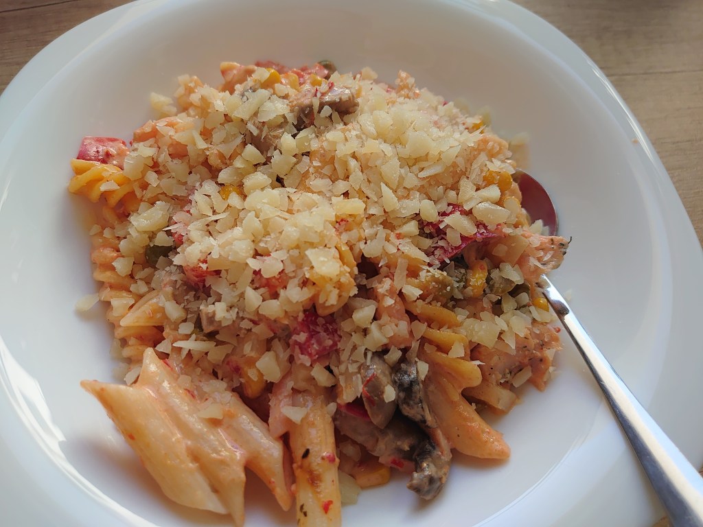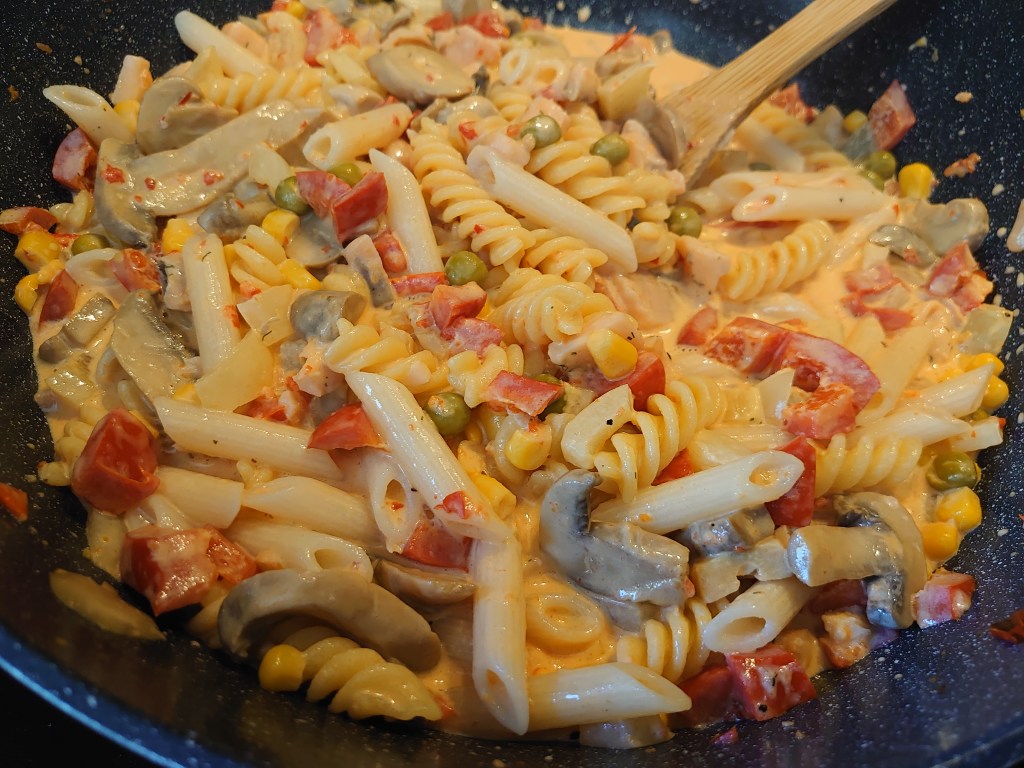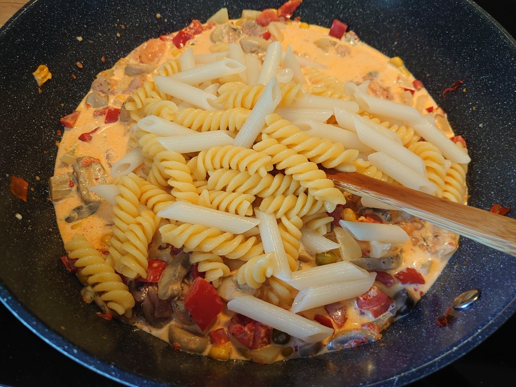 Heat a pot with boiling water and cook the pasta using the instructions on the packaging. You want the pasta to retain a bite to it – to be al-dente. In the same time, heat a pan with the 2 tbsp of olive oil and then sear the mushrooms in the pan, until lightly cooked. Add in the vegetables and cook those as well for 2 min.