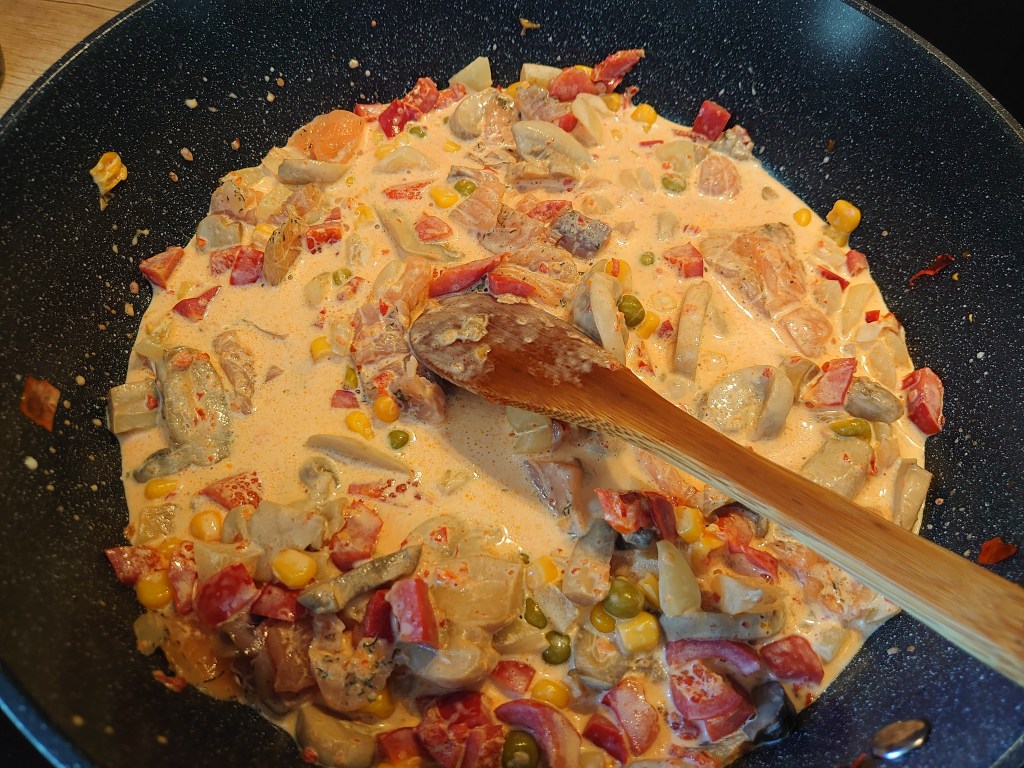 This dish takes advantage of well timed cooking. It’s very easy to make and very fulfilling. An essential part is to prepare all of your ingredients to have them at hand, as the dish will be fast. Cut all ingredients in medium-sized cubes.
